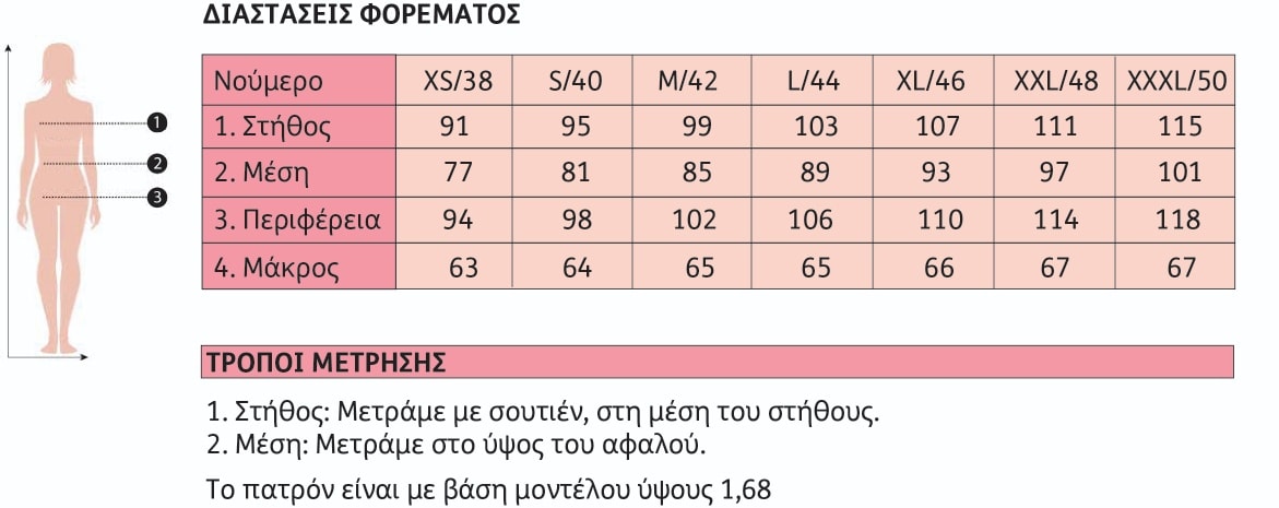 - Δεν φέρουμε καμία ευθύνη για τυχόν λανθασμένες μετρήσεις, παρόλα αυτά πάντα τσεκάρουμε τις δικές σας μετρήσεις σε σχέση με το πατρόν του ρούχου.