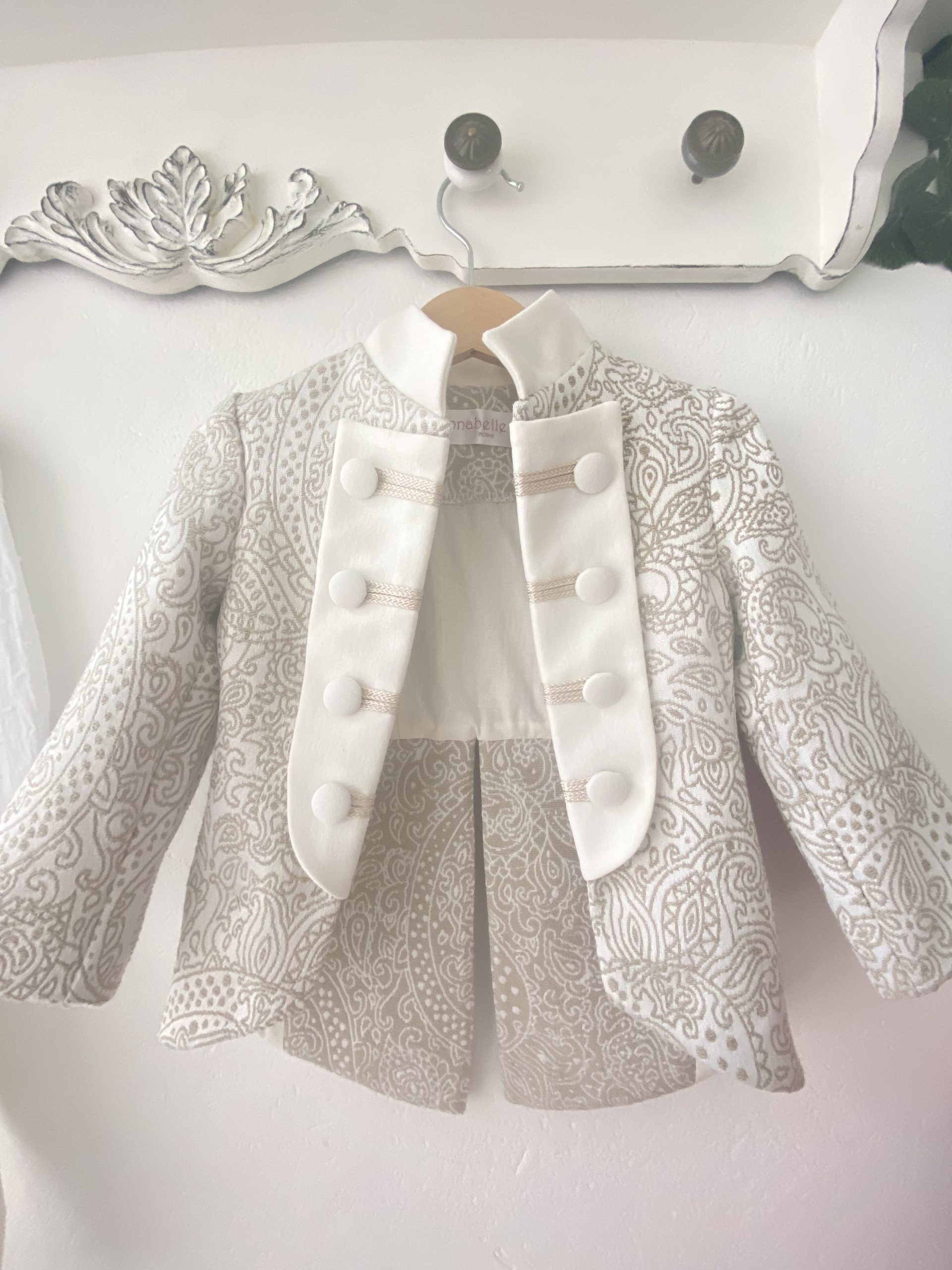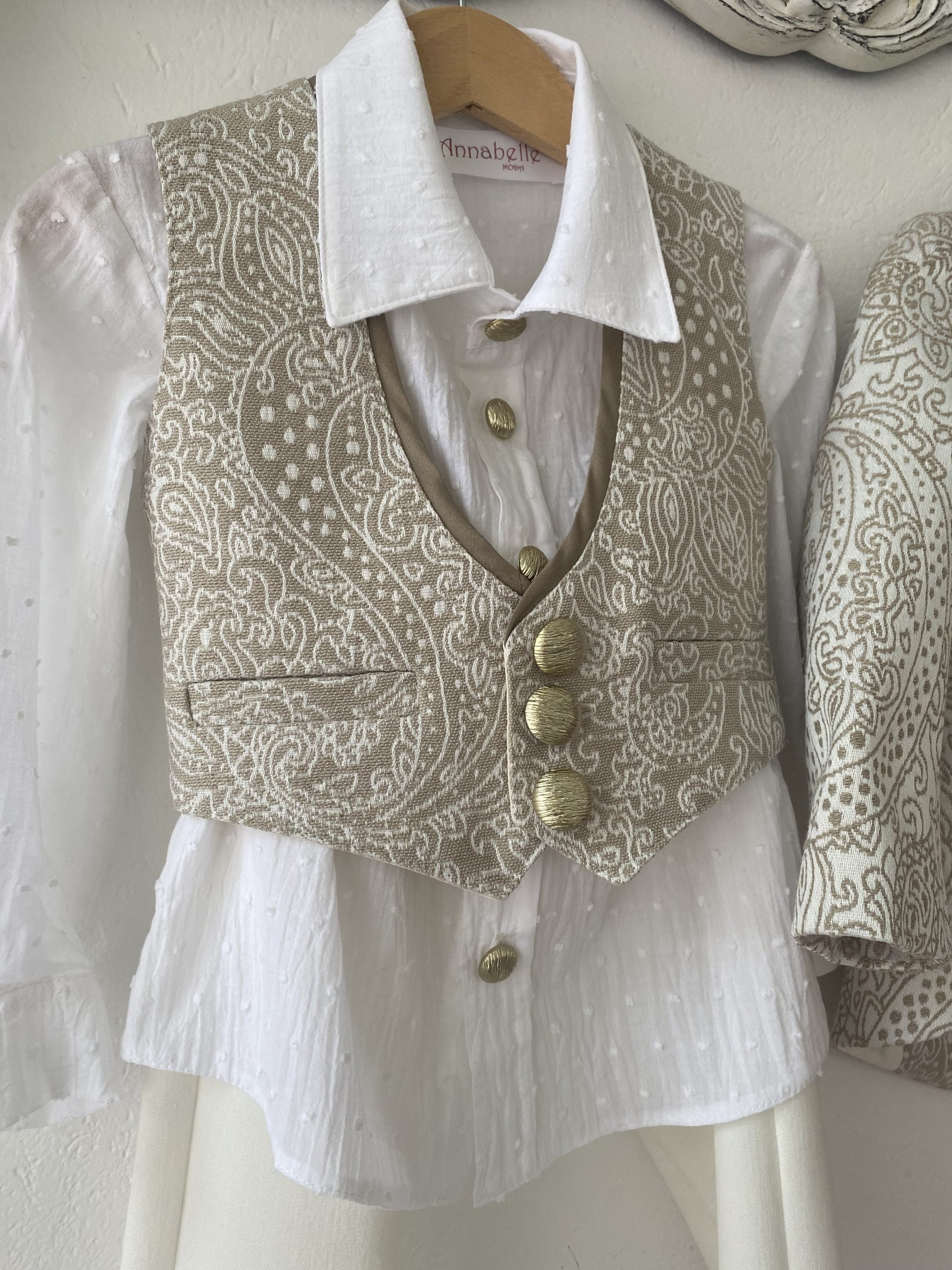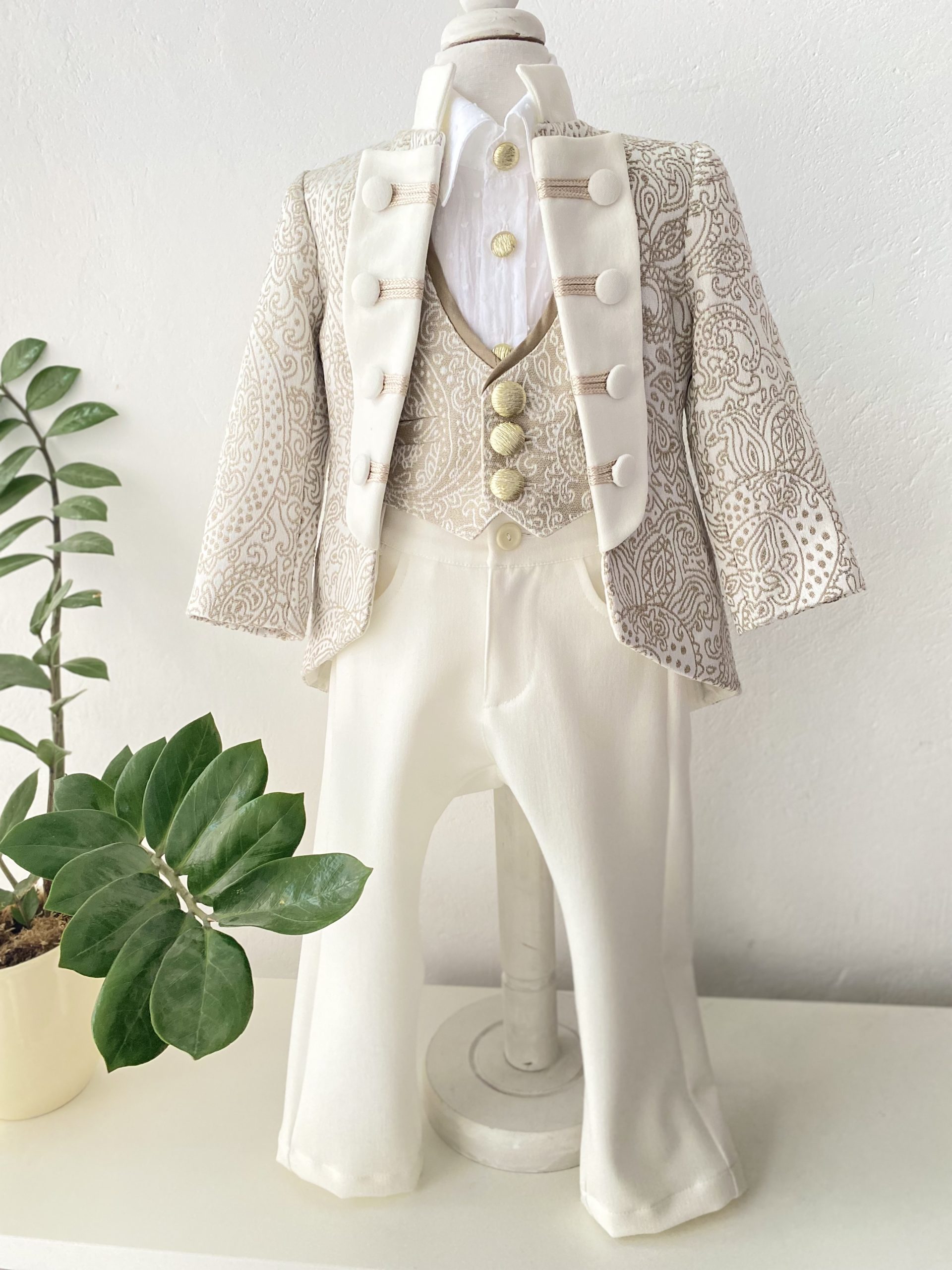 Κομψό μοντέρνο σετ με εξαιρετικής ποιότητας υφασμα μπροκαρ. Το σακάκι τύπου “frako style” σε εκρού χρώμα . Ενώ το γιλέκο ένα τόνο πιο σκούρο για αντίθεση .Μονόχρωμο πέτο του σακακιού είναι στολισμένο με κουμπιά φτιαγμένα από το ίδιο ύφασμα . Βαμβακερό παντελόνι σε ίσια γραμμή. Το σύνολο συμπληρώνει βαμβακερό πουκάμισο σε γραμμή tailored slim-fit. Χρυσά κουμπιά στο πουκάμισο και το γιλέκο δίνουν μια αριστοκρατική πινελιά στο ρούχο . Το σετ αποτελείται από 4 τεμ. (σακάκι, παντελόνι, γιλέκο, πουκάμισο). Ένα μοναδικό σύνολο για τον μικρό πρωταγωνιστή της ζωής σας.